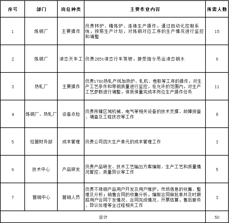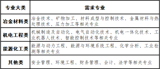 招聘主要有冶金工藝、軋鋼工藝、產(chǎn)品研發(fā)、機(jī)械、電氣設(shè)備管理等崗位,具體專業(yè)需求如下: